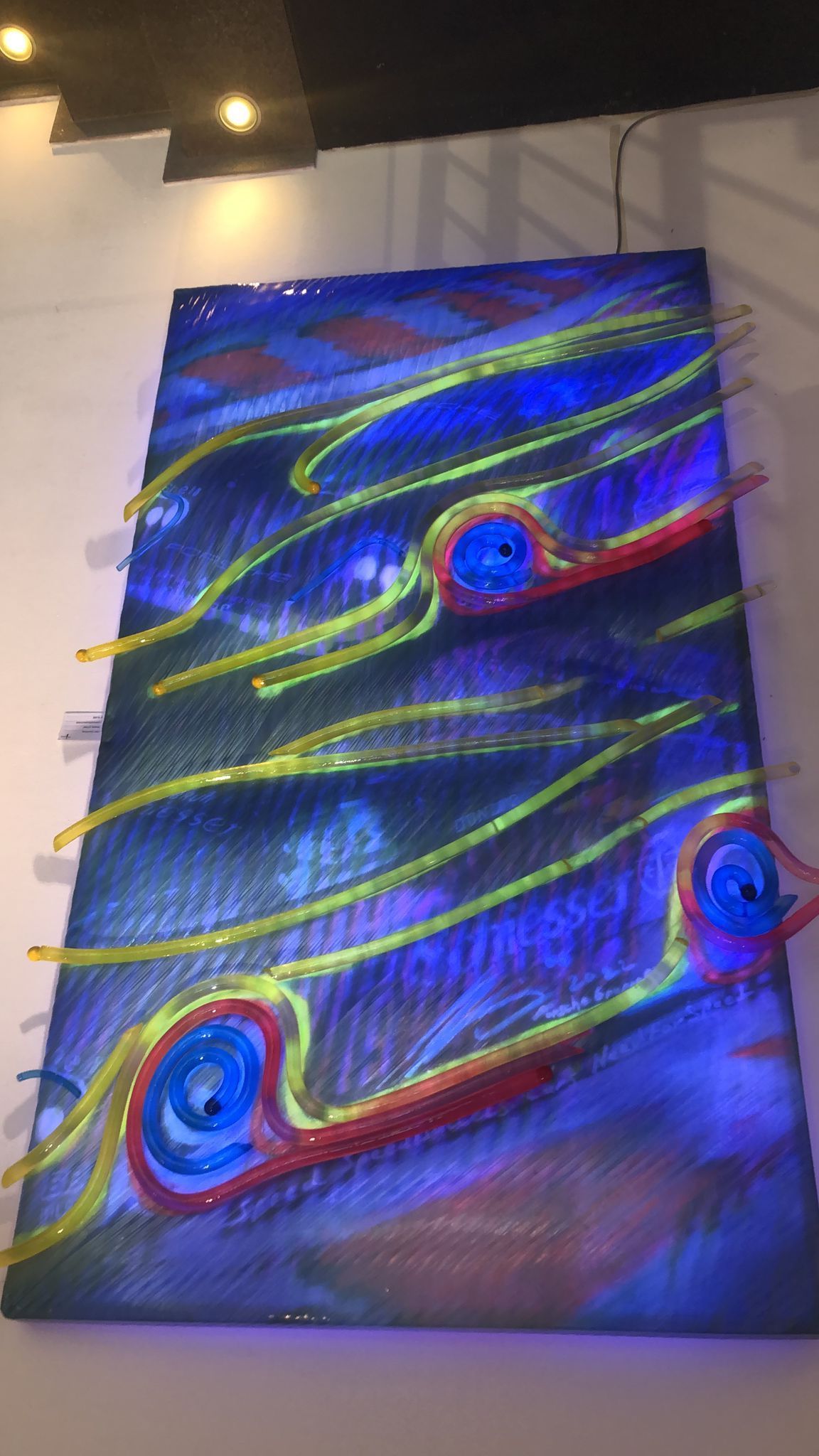Artwork unlit and lit with different color settings of the LEDs