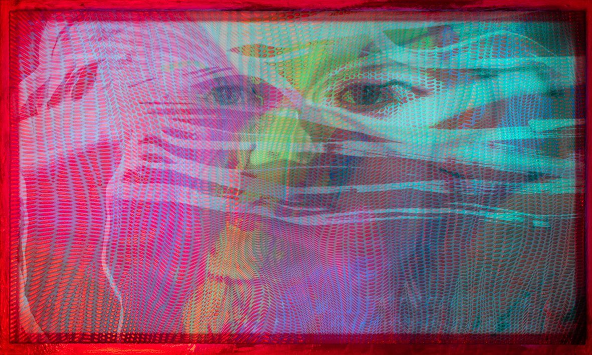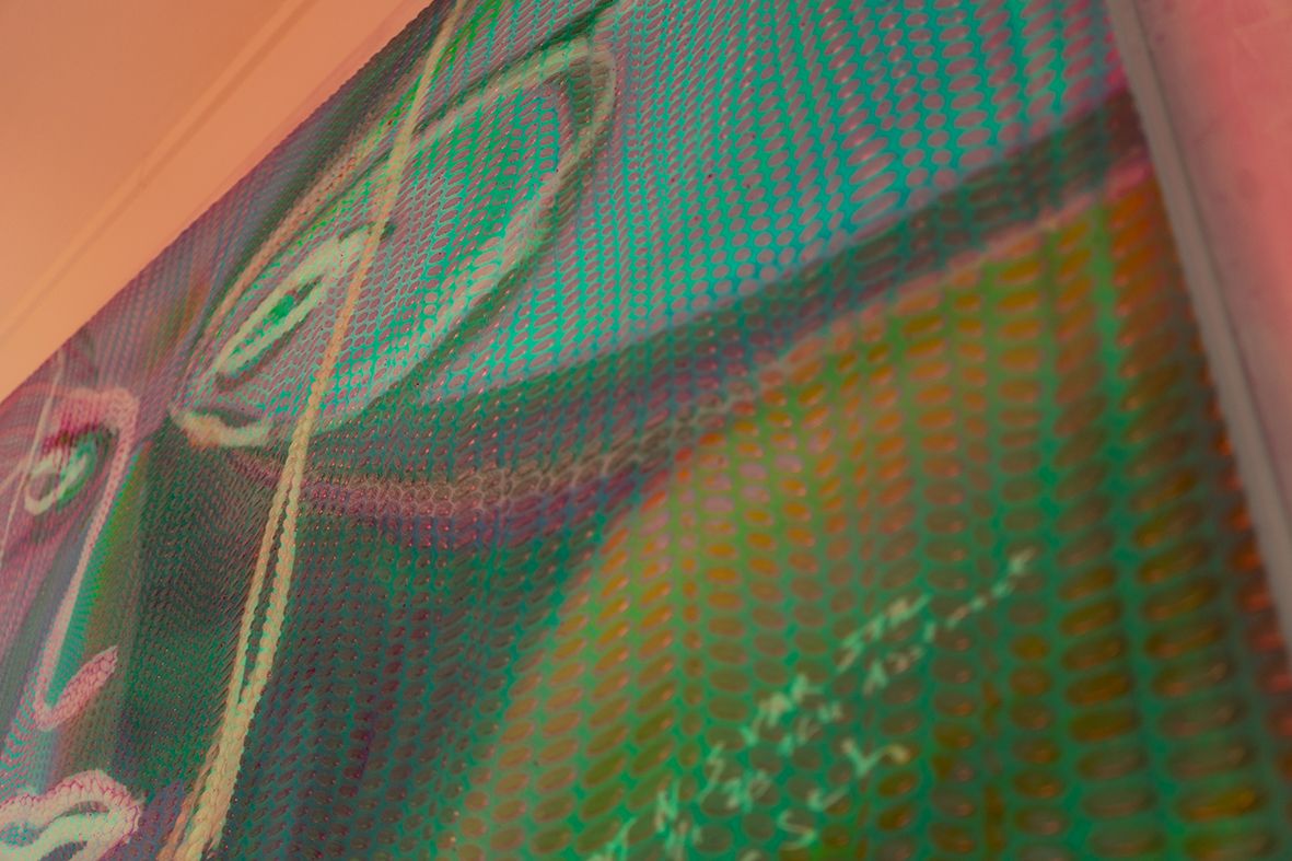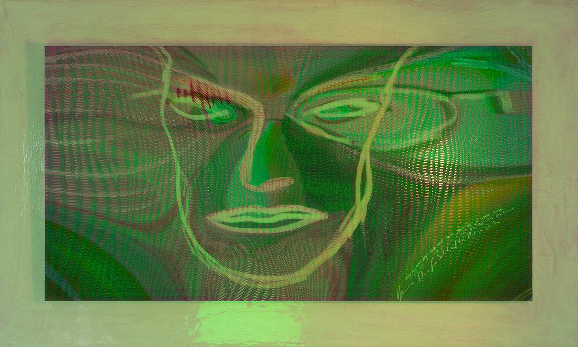 PiP (Picture in Picture): There are several pictures on the front of the picture, which in turn form the overall picture. Essential elements are the abstracted fish (upper half of the picture, left) and the whale (upper half of the picture, right). The alienated chair back (nose of the mythical creature) and the alienated window handles as feelers of the mythical creature. On the back of the picture is a picture of an abstract human being, reduced to a few white lines. The front of the picture is decoupled from the back of the picture below in the reflected light area. Only in transmitted light are the two images superimposed to form complex new images.